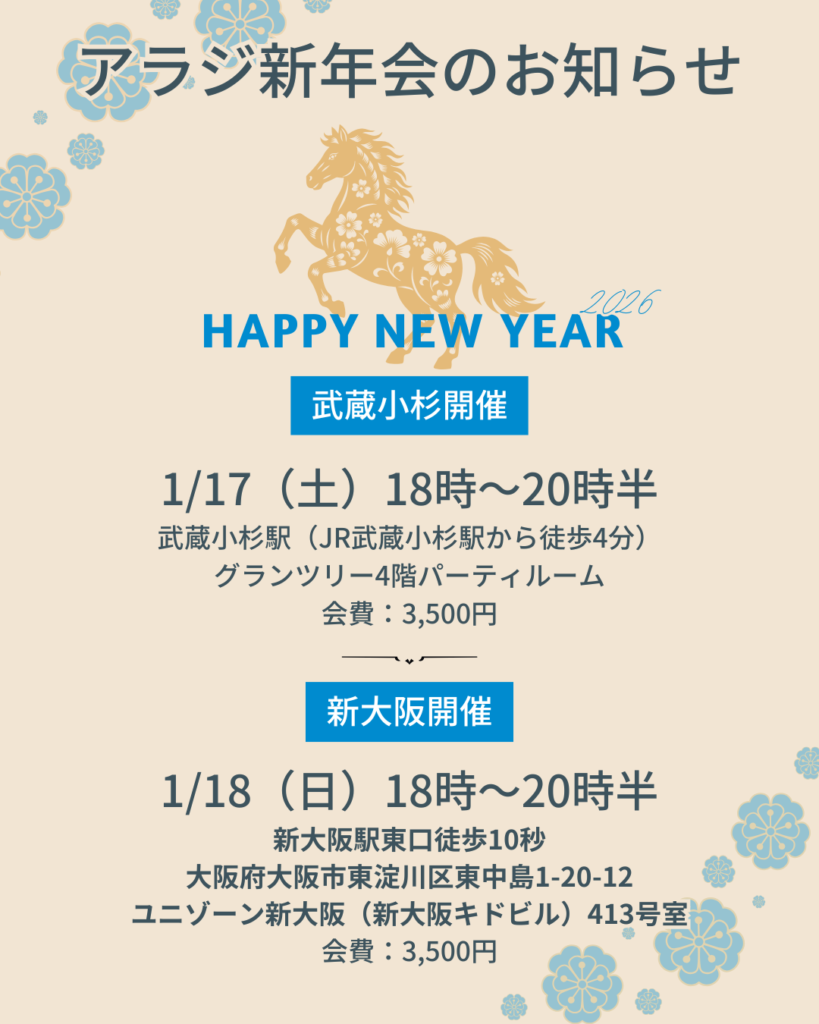 (2026年1月14日)新年会開催のお知らせ@武蔵小杉(1/17)&新大阪(1/18)